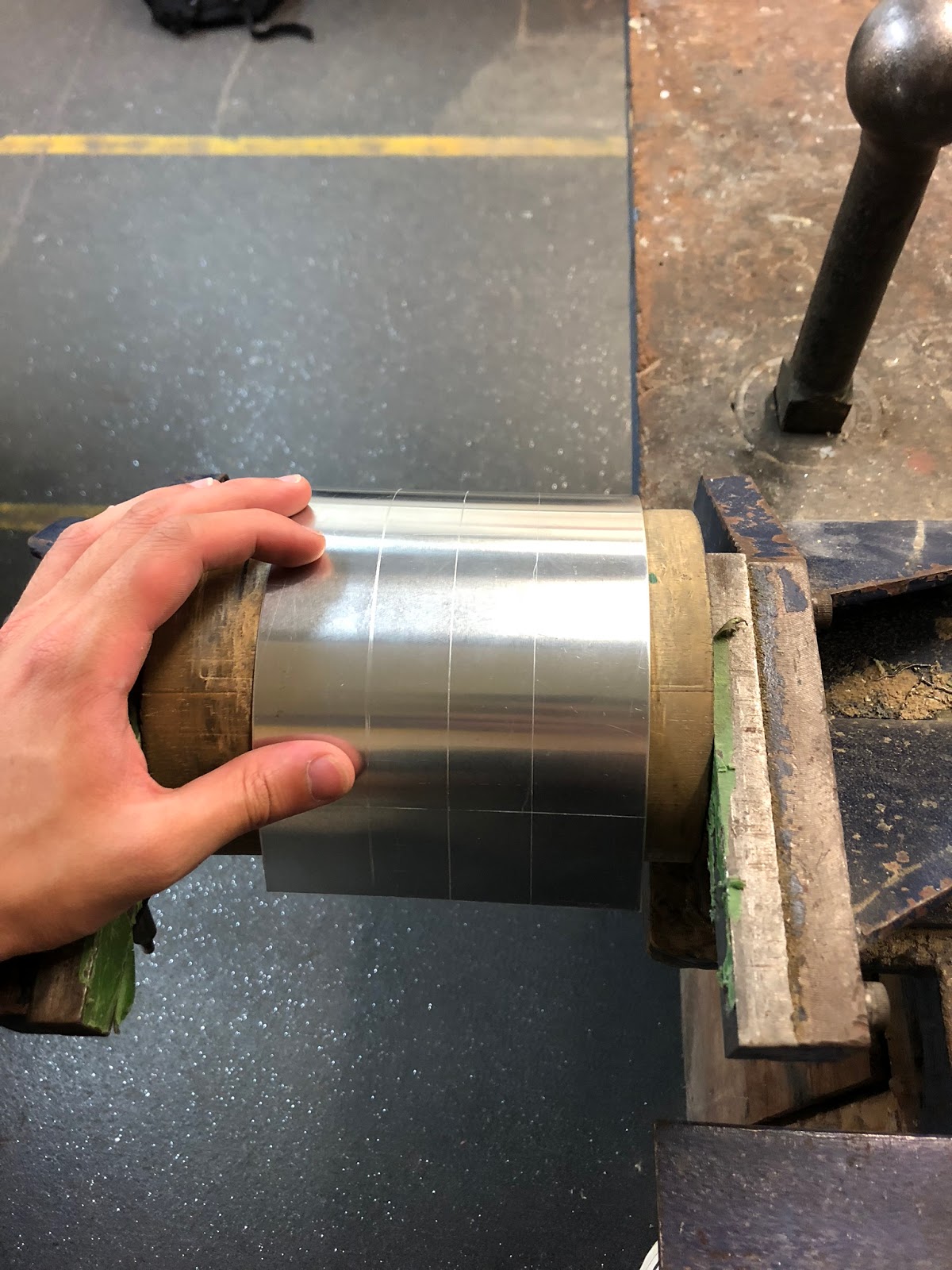 Starting with a rectangle aluminium sheet and use ruler to measure the centre line and lines which are parallel to the centre line which can be a good indicator for me to do the next step of hammering the centre of the metal using this block of reverse curve wood.
